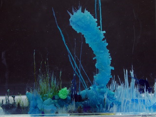Im Bild ist ein fertig gewachsener chemischer Garten zu sehen. Es wurde viel blaues Kupfersulfat verwendet. Dieses hat hier einen dicken knorrigen Ast gebildet. Grün, dunkelblau und bräunlich sind andere Salze zu sehen, welche mehr als Gestrüpp am Boden entlangwuchern. Rechts sind weißliche Alaunspitzen zu sehen. Bei Youtube gibt es ein Zeitraffer-Video des Wachstums eines chemischen Gartens: http://youtu.be/ukB04eH3w1c.